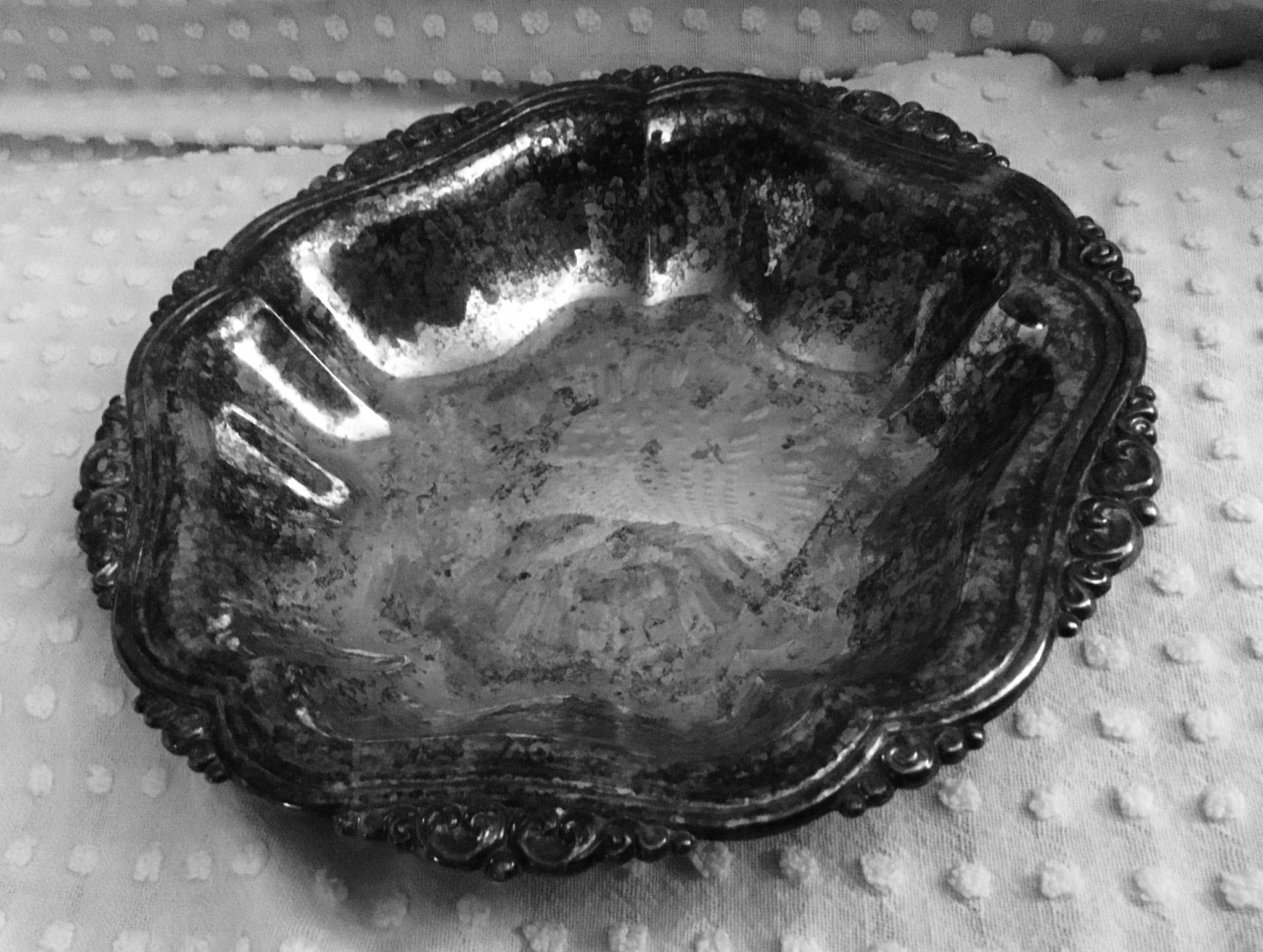 Vintage silver plated bowl with decorative scroll embellishments and 7” diameter.